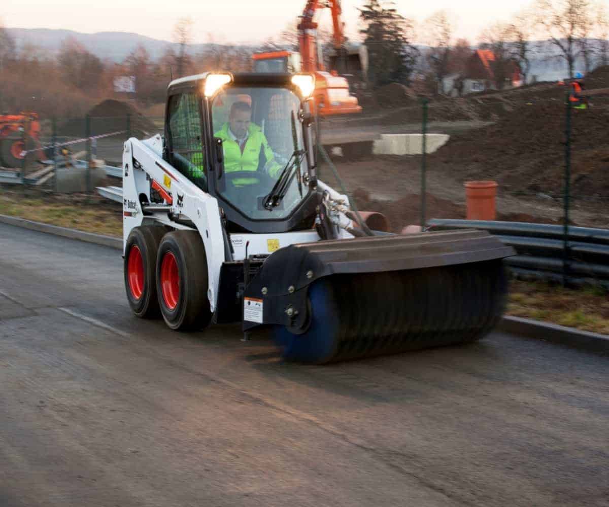 The Bobcat Angle Brooms feature fingertip controls for adjusting the broom angle, allowing precise cleaning along curbs and walls. This flexibility ensures thorough sweeping in various environments, enhancing operational efficiency.